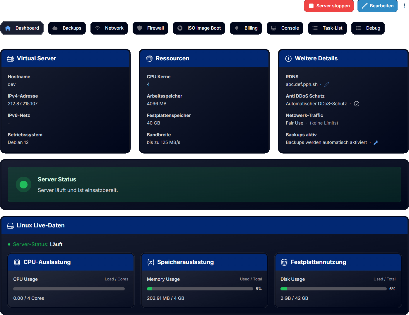 Unser neues Cloud-Management-Interface bietet dir volle Kontrolle über deine virtuellen Server mit einer intuitiven und leistungsstarken Benutzeroberfläche.
